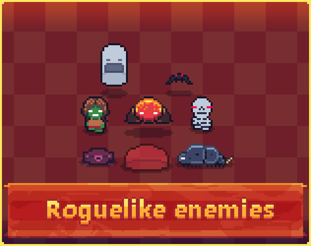 This asset pack includes a variety of enemies, each with their own unique animations, perfect for pixel-art roguelike games.